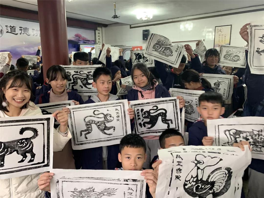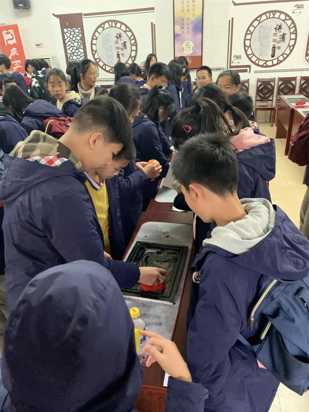 再看看,生肖拓印現(xiàn)場的同學(xué)們也非常認(rèn)真。在講解員的精心講解后,同學(xué)們用小盆中的刷子蘸取墨汁在拓板上從上到下的刷。最后用宣紙覆蓋在上面,再用小的紅色物品輕輕的按壓,形成成品??粗粡垙堄H手拓印的生肖畫,同學(xué)們可開心了!據(jù)說, 還有同學(xué)專門為自己父母拓印了生肖圖呢!